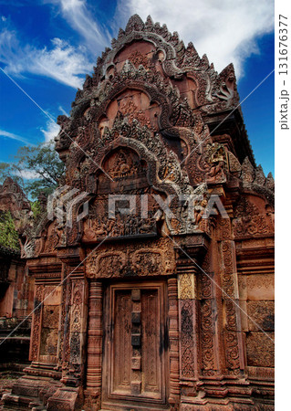 Buildings in Banteay Srei a 10th century Cambodian temple dedicated to the Hindu god Shiva made by pink and red sandstone in Siem Reap, Cambodia.