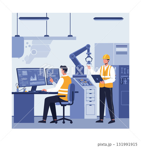 Industrial factory workers controlling robotic arm automation system in manufacturing environment
