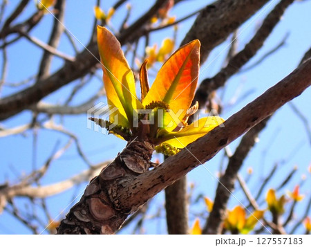 うりずんの晴天に輝くモモタマナの赤みの強い若葉