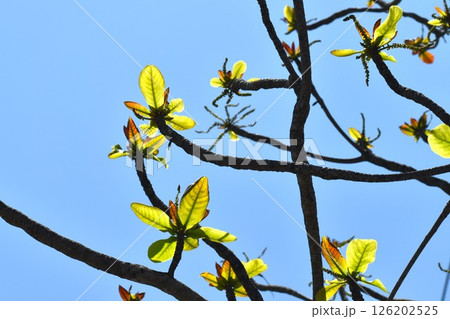 うりずんの晴天に透けるモモタマナの若葉のグラデーションカラー