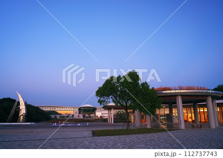 秋のモリコロパーク マジックアワーの西口広場からアイススケート場とジブリの大倉庫を臨む