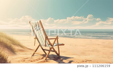 Beach chair on beautiful beach. Sunny day on a ocean shore. Travel paradise concept. Generative AI