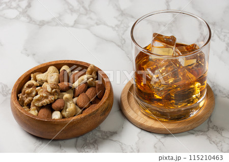 角氷のウィスキーロックとナッツのおつまみ