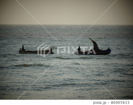 【マダガスカル】海で漁をする二艘のボートのシルエット(モロンベ)