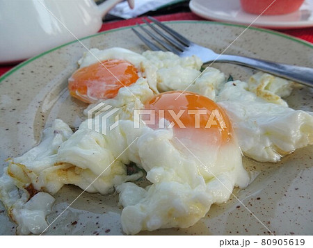 【マダガスカル】ホテルの朝食の半熟目玉焼きのクローズアップ(モロンベ)