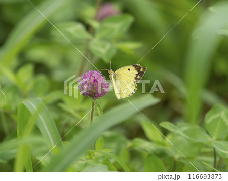 ムラサキツメクサの蜜を吸うモンキチョウ