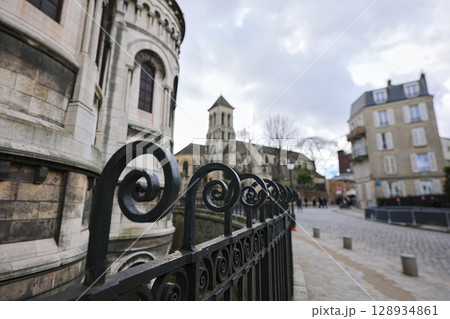 Sacre Coeur wall and Paris street through decorative railing