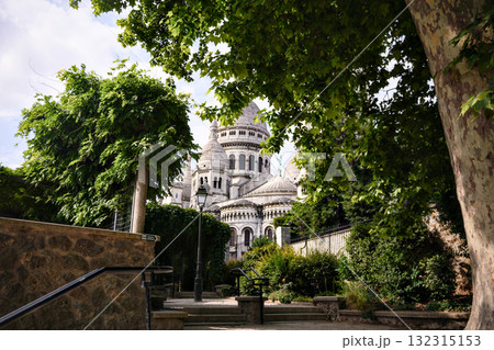 Sacre Coeur Basilica in Montmartre Paris with green trees and stone stairs