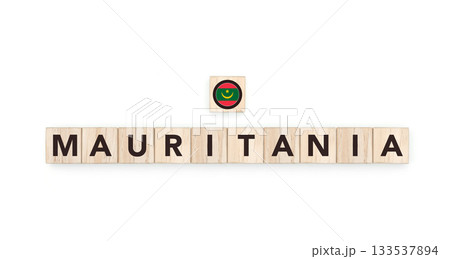 Wooden blocks bearing the name and flag of Mauritania. Mauritanian and African and Arab Culture, national identity, travel, and geography in a copy space design.