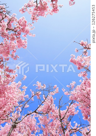 青空に映える満開の八重紅彼岸桜 【青空背景】