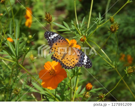 コスモスで吸蜜するオスのツマグロヒョウモン