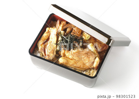 タレがたっぷりかかった熱々炭火焼き鳥重を白背景で俯瞰撮影