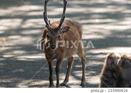 屋久島の西部林道の鹿と猿