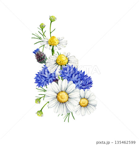 Chamomile flowers with cornflower wildflower bouquet watercolor illustration. Hand drawn vintage style illustration meadow flowers mix of daisies and blue cornflowers on white background