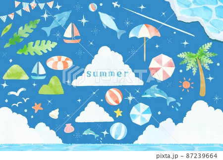 夏 海 青空 水彩 手描き ビーチ スイカ