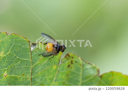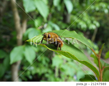 全身に黄色い毛が生えている休憩中のコガネオオハリバエ