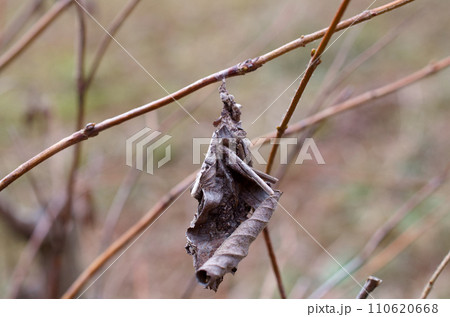 天敵の外来種ハエにより数が激減している、オオミノガの蓑虫の写真