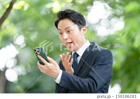 ビジネス 男性 新緑 スマホ 驚く