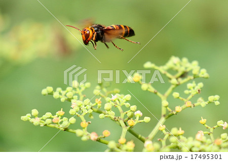 生き物 昆虫 オオスズメバチ、ヤブカラシで吸蜜中。食事に夢中で近づいても逃げません