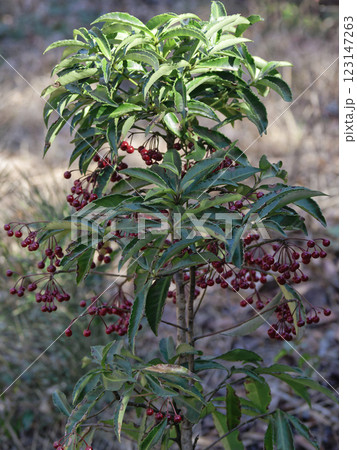 サクラソウ科の常緑低木 マンリョウの赤い実