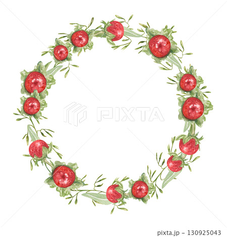 Watercolor red Duchesnea indica berries wreath on isolated background. Mock strawberry with leaves round frame. Floral illustration for herbal medicine design, healthy food decor, packaging, label.