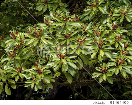 自然 植物 タブノキ、四月初め。艶々の葉が集まった枝先に沢山の花芽が付いています