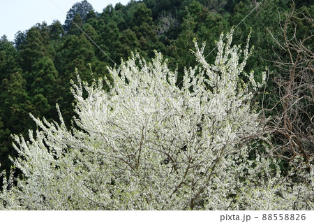 長野県南牧村、ヤマナシの花咲く早春の平沢峠