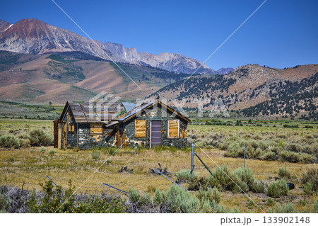 Abandoned House with Crow in Sagebrush Meadow and Sierra Nevada Mountains