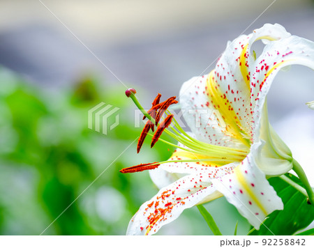 野生のヤマユリ 自然背景 白い花 オレンジ色の斑点