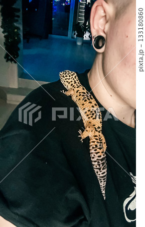 Colorful leopard gecko resting on shoulder of individual, showcasing unique patterns and textures in a cozy indoor environment with soft lighting
