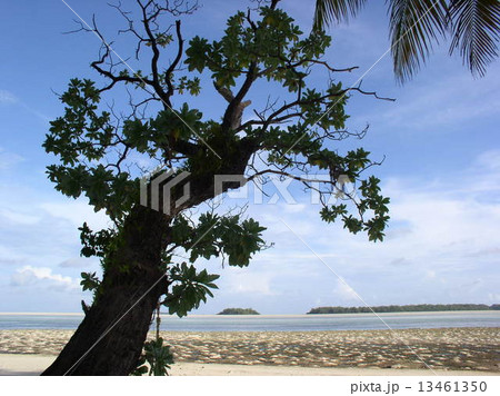 パラオ・カープ島の砂浜と斜めに傾いた樹木