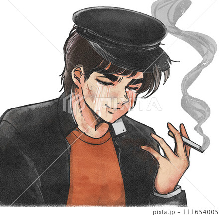 昭和時代の不良番長が泣きながら煙草を吸うイラスト