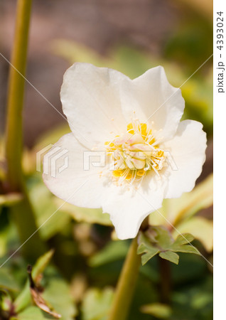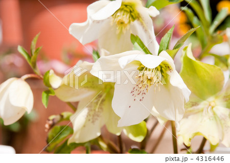 季節の花早春の素材・クリスマスローズの白い萼片・群生横位置