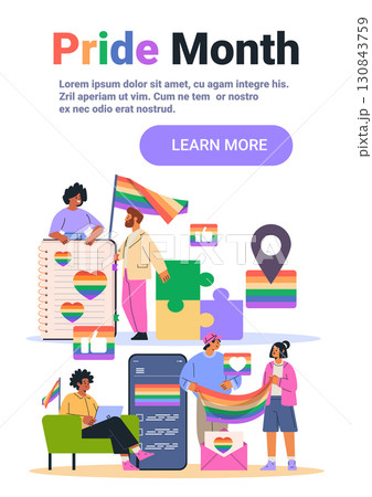 Pride month celebration LGBTQ community people rainbow flags hearts digital social media icons diverse group puzzle background landing page