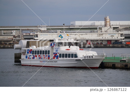 大阪港の桜島と天保山を結ぶキャプテンライン:ユニバーサルシティポートから遠望した大阪キタの高層ビル群