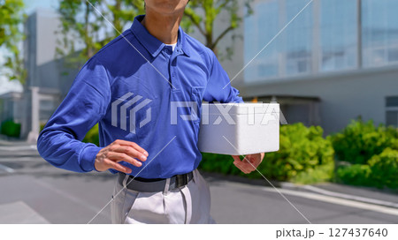 Mover team working together, two men wearing work uniforms are carrying cardboard boxes in room