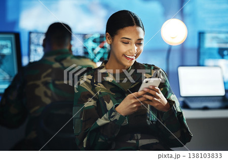 Phone, military and woman soldier in the control room in uniform for war or battle networking. Happy, smile and young female army warrior typing a message on internet with cellphone for surveillance.
