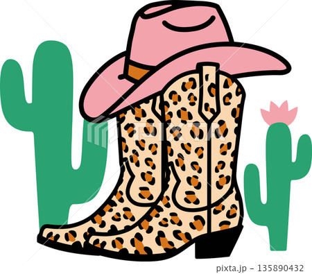 Leopard Cowboy Boots and Pink Hat with Cacti Cartoon Illustration