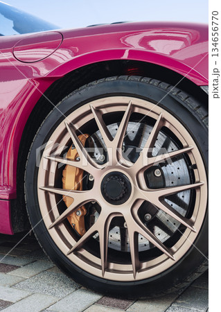 Luxury car with stylish wheels parked on modern pavement during daytime