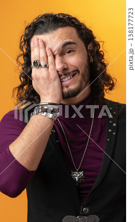 Man with curly hair covers one eye and smiles against a yellow background