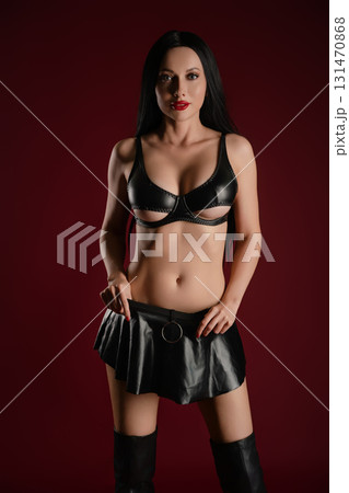 Woman showcases striking leather accessories in a stylish studio setting