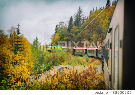 White Pass and Yukon route railroad train ride on old transport rails in Alaska, USA. Nature landscape of Alaska travel cruise excursion.