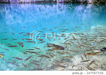 クロアチアの世界自然遺産プリトヴィッツェ湖群国立公園 下湖群の湖の鮮やかなブルーと泳ぐ魚
