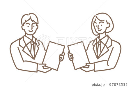 カタログ・資料をもって説明する会社員・男女セット(線画)