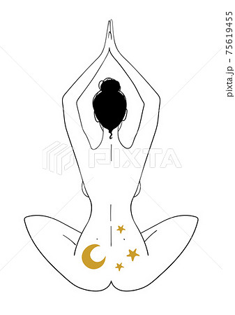 Mystical illustration with a seated meditating woman. Nude girl meditates in lotus position, boho illustration. Vector isolated on white background.