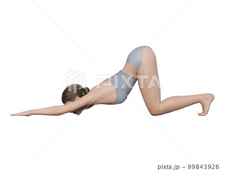 ヨガポーズ ヨガの子犬の伸びのポーズをする女性 ナチュラルな日本人3Dモデルの全身横向きのイラスト
