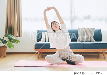 自宅で体をほぐすストレッチをする30代女性の健康習慣