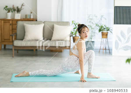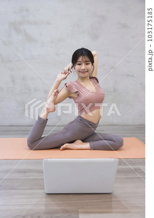 リモートレッスンをする若い女性ヨガ講師 鳩のポーズ