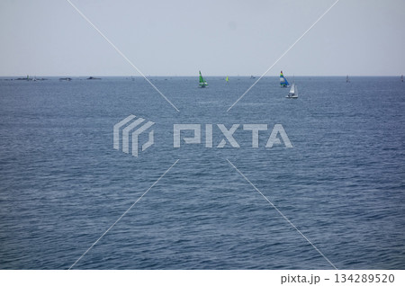 神奈川県逗子市と葉山町:遠くの海上にヨットやウィンドサーファーなどの帆が見える