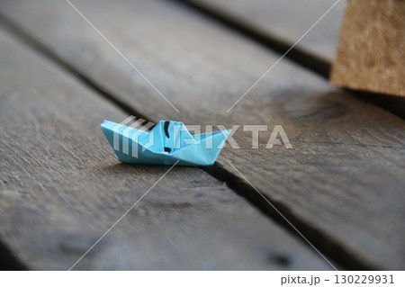 Paper boat on vintage wooden background